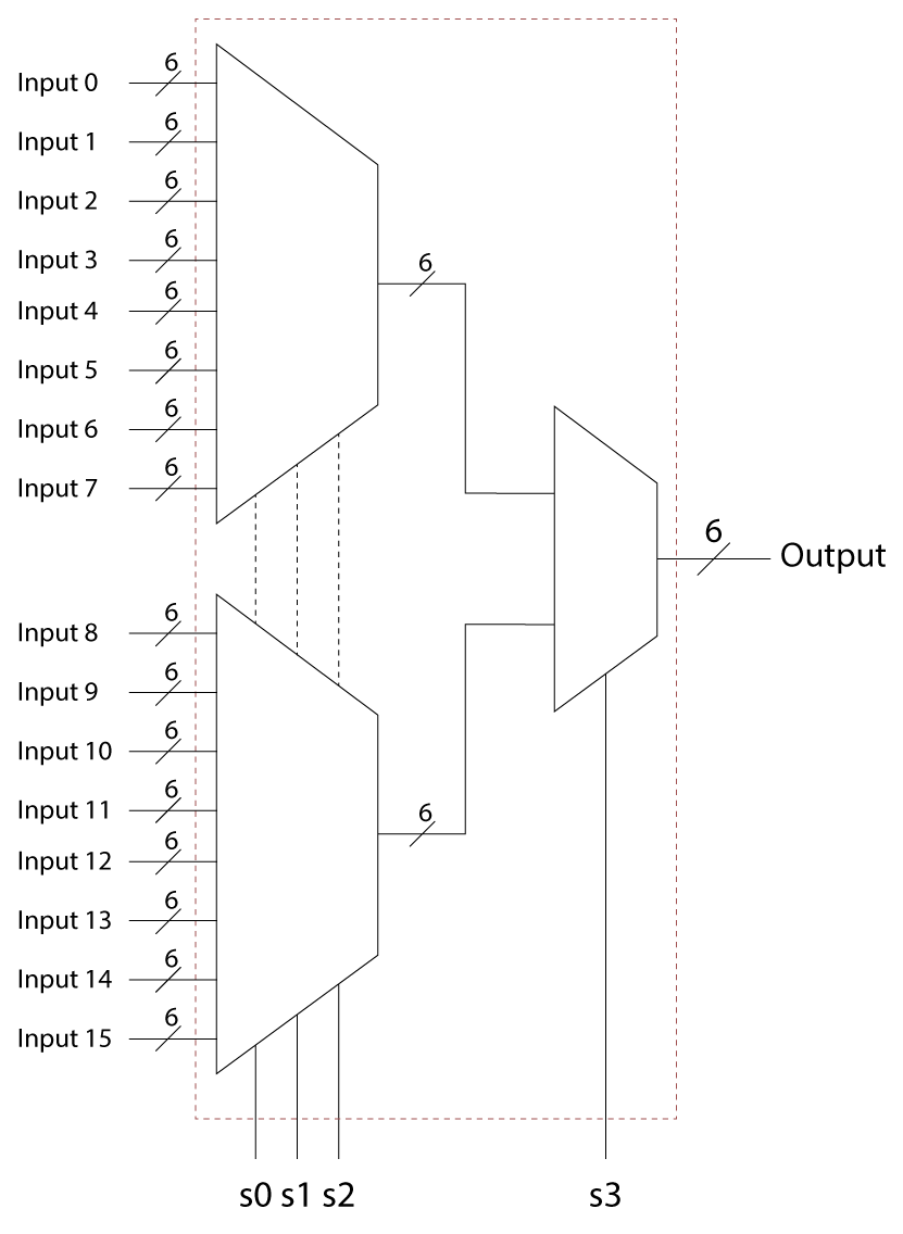 - First stage: Use 2 MUX (each handles 8 inputs)